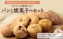 愛媛県 東温市産のはだか麦粉を使った グルテンを使用しない パンと焼菓子のセット 計8個 プレーン レーズン オレンジピール クリームチーズ ベーグル チョコチップ マフィン パン 焼菓子 菓子 スイーツ デザート 朝食 昼食 おやつ (511)