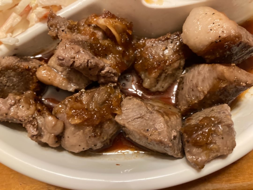 パッとみて、一切れが小さくてたくさん入っている感じでした。焼いて食べてみると、硬くて噛みきれないのが2割程度ありました。食感が異なるものが多く、いろいろな部位が入っている感じ。味は悪くないのですが、残念でした。もう少し一切れは大きくして、筋を切ってはどうかと思います。