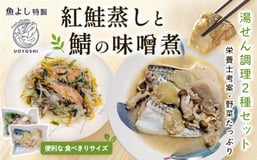 魚よし特製 湯せん調理2種セット 各2パック(紅鮭蒸しと鯖の味噌煮)【煮付け 魚介蒸し 魚 お野菜 真空冷凍 湯せん調理 メインディッシュ 紅鮭蒸し 鯖の味噌煮】K095009