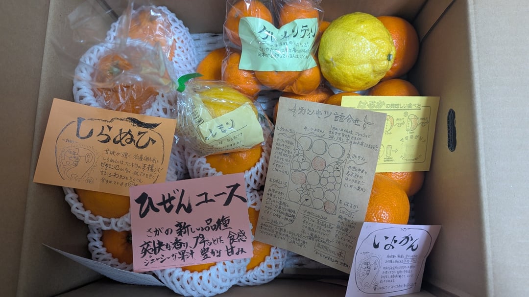 柑橘類がダンボール箱いっぱいに入っており、それぞれの品種の紹介や食べ方まで丁寧に書かれたメモも同封されていて、味はもちろん、生産者の方の心配りにとても感動しました。