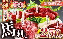 【 定期便 12回 】純 国産 熊本 馬刺し 4種類 250g | 肉 にく お肉 おにく 馬 馬刺 赤身 霜降り ふたえご たてがみ 小分け 専用タレ 定期 熊本県 玉名市