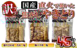 a1030 【数量限定】《訳あり》国産!直火で焼いた焦がしやきとり(盛り合わせ・たれ)(盛り合わせ・塩)(豚バラ串・塩)【計46本】【フタバフーズ】姶良市 鶏肉 鳥肉 焼鳥 やきとり もも ねぎま 皮 ぼんじり つくね 豚バラ タレ 塩 セット 小分け 加工品 総菜 おかず