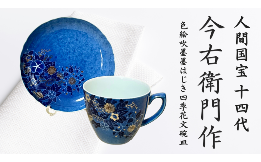 NEW【有田焼】人間国宝 14代今右衛門作 色絵吹墨墨はじき四季花文碗皿【本人作】