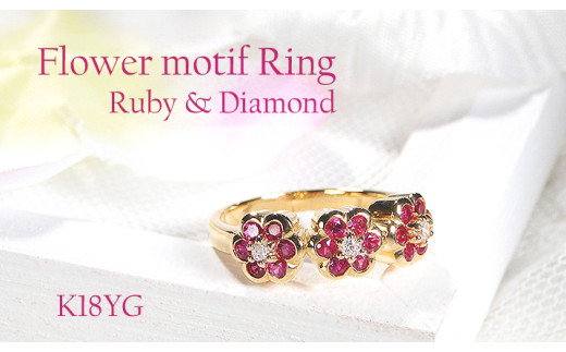 指輪 K18YG イエローゴールド ルビー ダイヤモンド 0.1ct 3連 フラワーモチー...