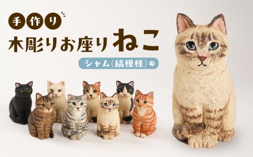 NEW手づくり木彫りお座りねこ【シャム(縞模様)】